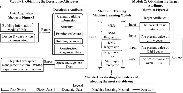 In this project, the research team aimed to develop a comprehensive framework for creating machine learning models to predict facility life-cycle costs (LCC). We first conducted a literature review and a questionnaire survey to identify key variables affecting facility LCC. Utilizing this information, they proposed a structured approach for developing LCC analysis models using machine learning. This approach included data collection, model training, and evaluation steps. To demonstrate its practical application, we conducted a case study on Georgia Tech campus, developing predictive models for estimating the LCC of facilities. The study concluded that existing building systems contain sufficient data for effective LCC analysis using the proposed framework.
